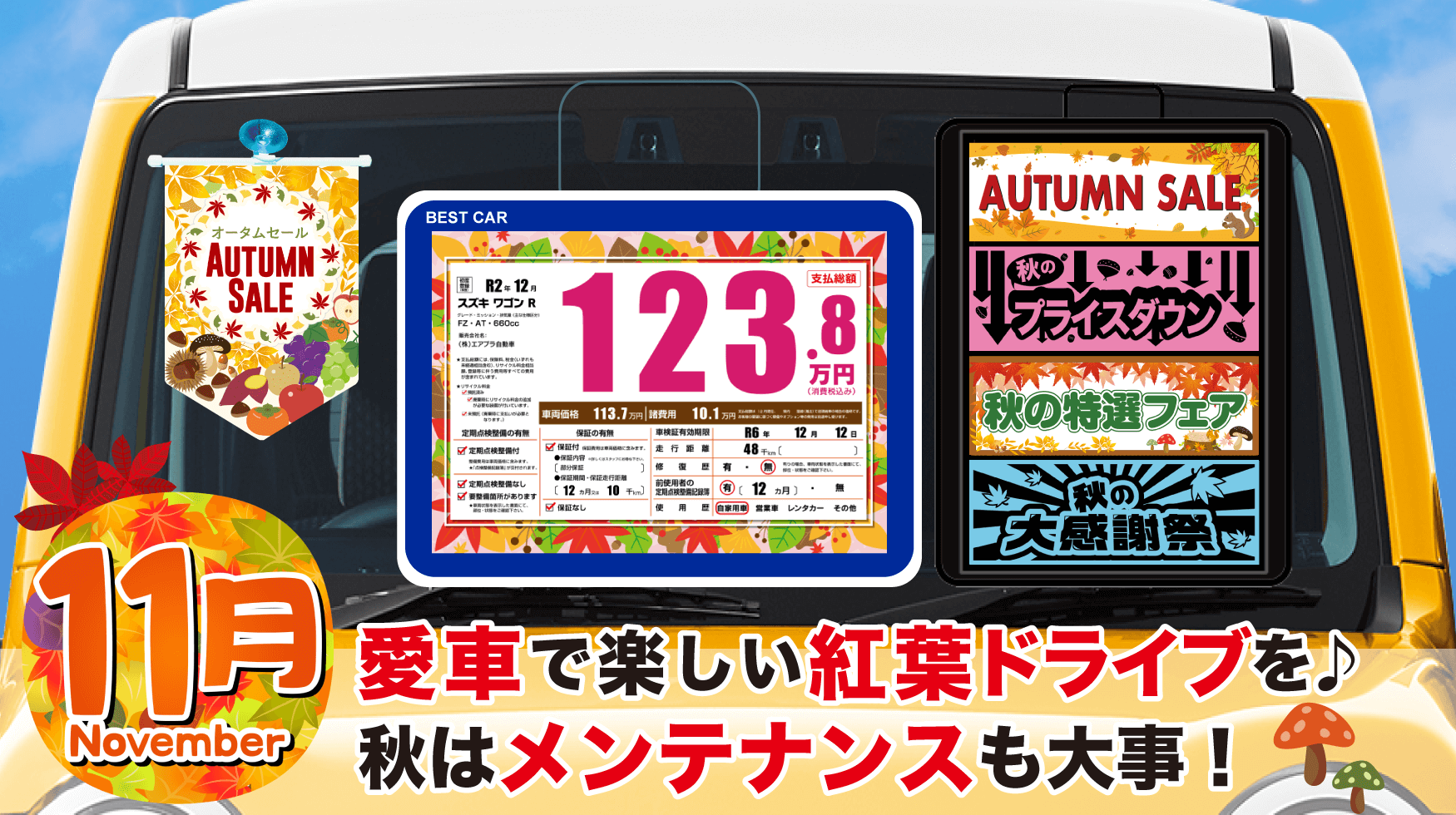 展示車を『紅葉』仕様にすると、色鮮やかな雰囲気でパッと目につきやすくなります。来店してくださったお客様に秋を楽しんでいただけるようにしましょう。
