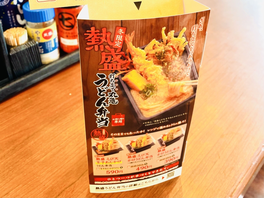 店頭ののぼりから、写真付きのメニュー、テーブルには旬のうどんのPOP――