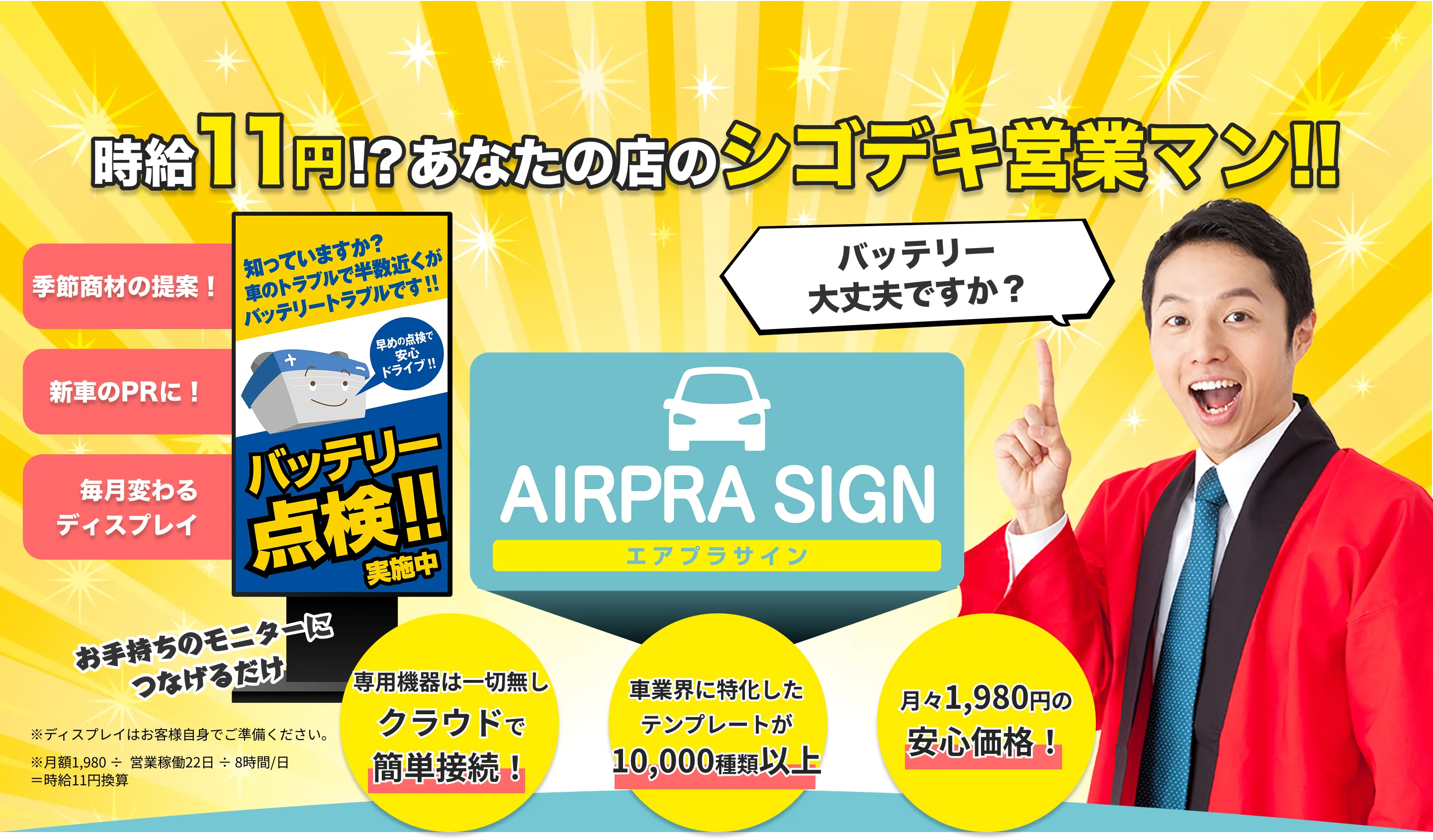 リスクを最小限に抑えつつ、“デジタルサイネージ風”に情報を流すことができるのがエアプラサインです。